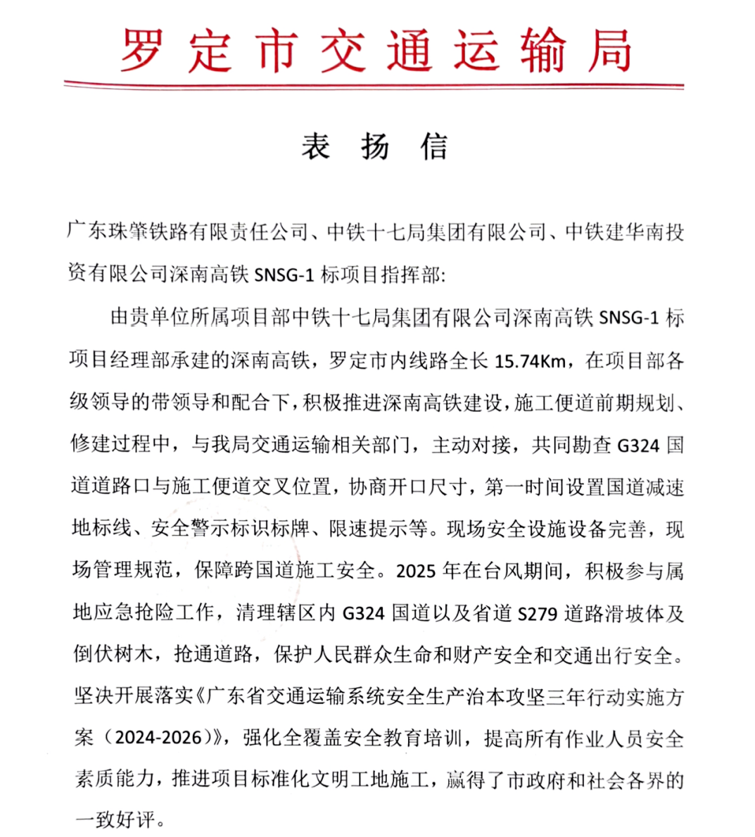12月18日,羅定市交通運(yùn)輸局向深南高鐵指揮部及相關(guān)單位發(fā)出表揚(yáng)信,對其在深南高鐵羅定段建設(shè)中作出的突出貢獻(xiàn)予以充分肯定。信中指出,指揮部在跨國道施工安全保障、臺風(fēng)期間應(yīng)急搶險響應(yīng)等方面積極主動,展現(xiàn)了高度的責(zé)任擔(dān)當(dāng);同時嚴(yán)格落實(shí)安全生產(chǎn)治本攻堅(jiān)三年行動要求,扎實(shí)推進(jìn)標(biāo)準(zhǔn)化文明施工,贏得了政府與社會各界的一致好評。信中贊揚(yáng)各單位以“不忘初心、不畏艱難”的鐵道兵精神,為深南高鐵助力粵桂區(qū)域協(xié)同發(fā)展奠定了堅(jiān)實(shí)基礎(chǔ)。
